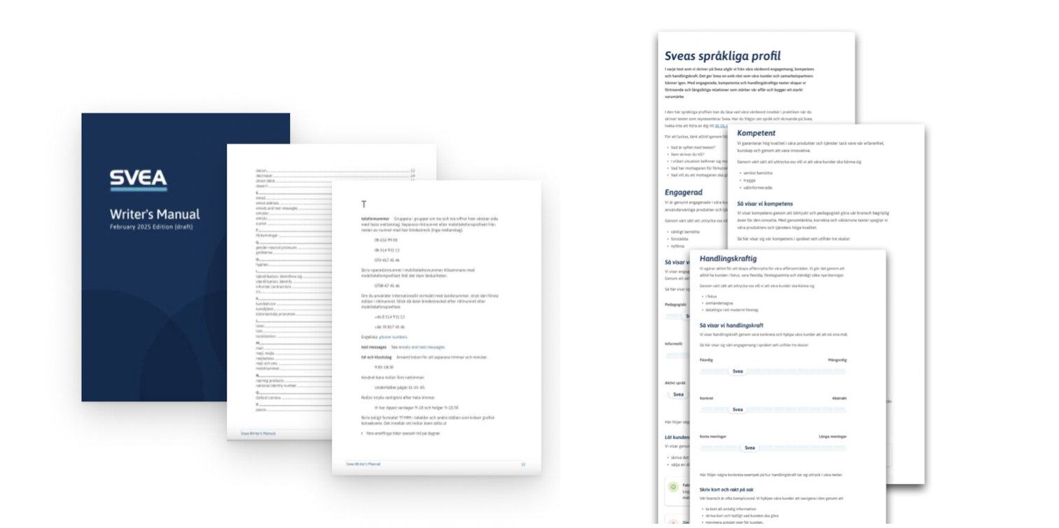 En enhetlig och användarvänlig tonalitet i Sveas digitala produkter. Språkprofilen implementerades brett i organisationen och används som stöd i design- och utvecklingsarbetet.